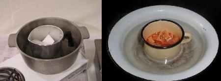 В меньшую кастрюлю кладется воск, затем ее ставят в большую по объему кастрюлю с водой. И затем все это ставится на огонь.