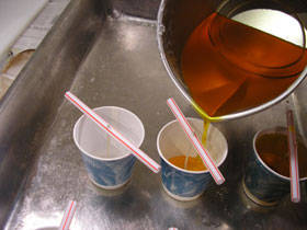 Все тщательно перемешивается и отправляется на плиту. После того, как воск нагреется до 80 градусов, кастрюльку снимают с плиты и воск аккуратно разливают по стаканчикам.