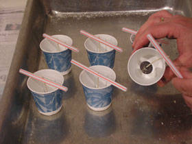 Берутся трубочки для коктейлей, и к ним привязывается фитиль. Располагаем трубочки таким образом, чтобы фитиль находился посередине стаканчика.