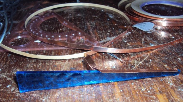 После примерки стеклышек начинаем обклеивать каждое из них медной лентой, имеющей с одной стороны самоклеющуюся основу, наподобие монтажного скотча.