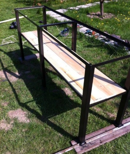 Привариваем полку, выводя ножки ровно. Зачищаем все швы, валим конструкцию набок, привариваем пятки, зачищаем и открашиваем молотковой эмалью. Пол в сарае ровный, но уплотнители-резинки мы туда по-любому будем ставить, как же без них?