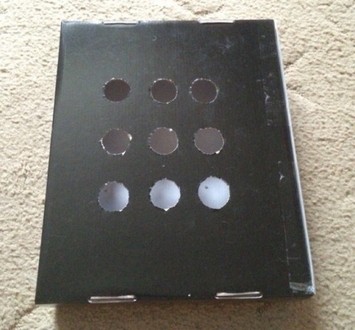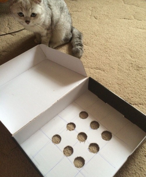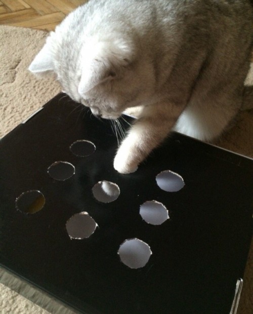 Открываем ее крышку и делаем в ней отверстия. Отверстия лучше делать под лапу, то есть чтобы кошка без труда смогла ее туда просунуть, но не более. Таких отверстий делаем несколько, по всей площади коробки, через расстояние между ними примерно 8-9 см. В итоге получится «решето», через которое кошка сможет просунуть лапу, но не сможет подцепить что-либо из коробки.