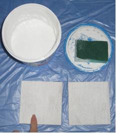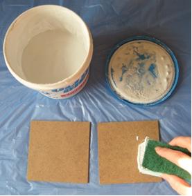 Приступаем к производству нашего творения. Рабочее место предварительно застилаем клеенкой, а то ведь дело такое, можно изготавливая что-то защитное для мебели, попортить эту самую мебель, что сведет на нет все ваши усилия. Стол лучше застелить клеенкой, чтобы не запачкать его. Кладем заготовки, берем губку, макаем ее в акриловую краску.