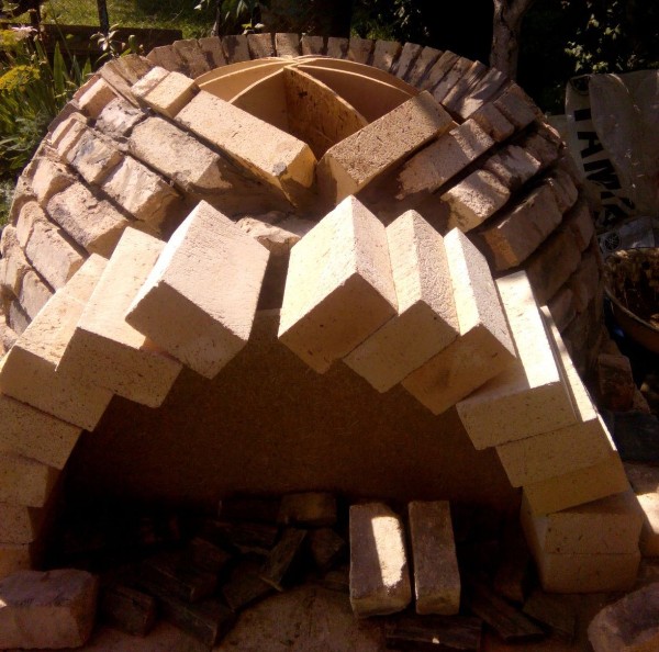 Примерно 2 ряда получалось выложить за вечер, вместе с заготовительными операциями. Постепенно формируем. Чем выше свод - тем труднее и утомительнее. Диаметр меньше, кирпич приходится пилить на 3-4 части, а иногда и тоньше, чтобы перекрыть швы предыдущего ряда.