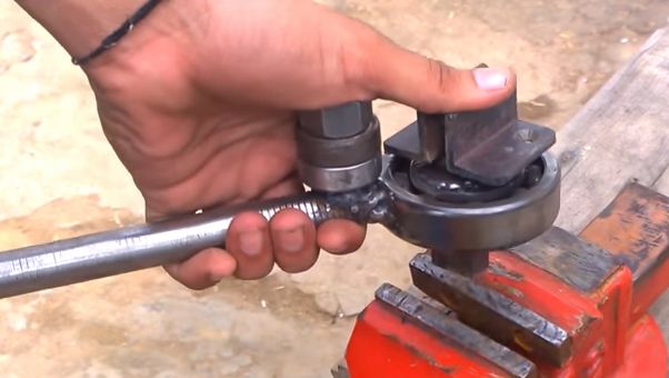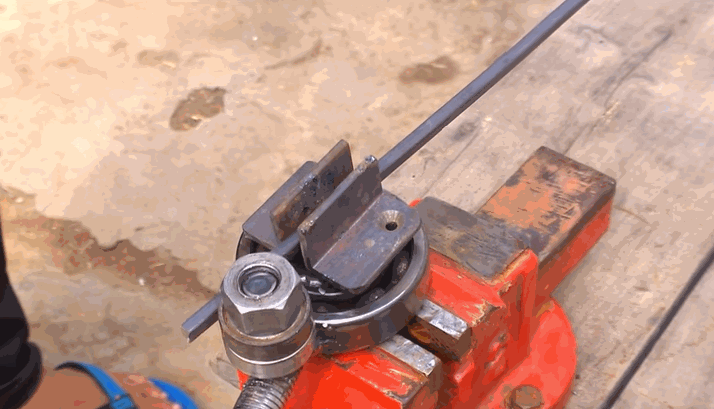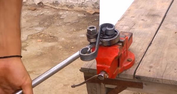 Теперь посмотрим как это будет в процессе. Надо будет вставить приспособление в тиски, потом вставить заготовку - шинку и теперь можно крутить рычагпротив часовой стрелки, если смотреть сверху.