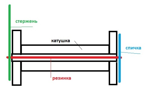 Резинка продевается через отверстие в катушке и надевается на спичку.