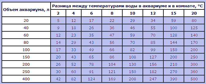 Так по таблице, зная объем вашего аквариума и минимальную температуру воздуха, которая у вас бывала или есть в квартире (офисе), вы сможете подобрать нагреватель соответствующей мощности.