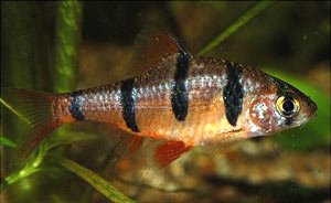 Этот вид барбуса отличается яркой окраской с темными полосами поперек тела. По характеру мирный, активно передвигающийся по аквариуму. Желательно иметь аквариум длиной до 80 см, с хорошей фильтрацией. Грунт в аквариуме темный из мелкого песка. Растительность располагается вдоль стенок. Должно быть много места для свободного плавания. Привлекают этих рыбок и коряги, выполняющие и декоративные цели. Освещение приглушенное, поскольку при ярком освещении рыбки становятся пугливыми. Обитают стайками в 6-8 особей. Характеристики воды: 20-26 градусов Цельсия; рН=5,5-6,5; dH=4-10°