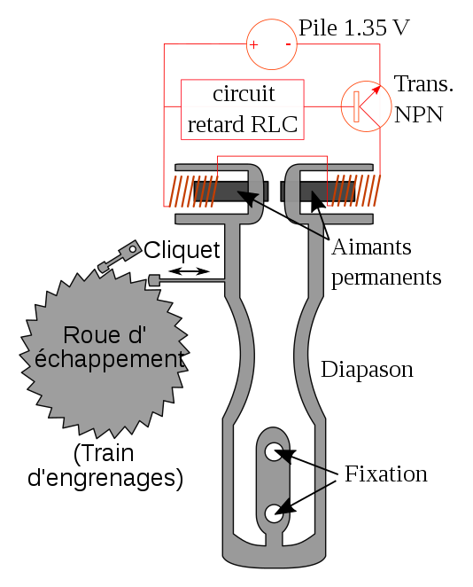 В обе консоли вилки были встроены постоянные магниты, а механизм содержал электромагнитные катушки. Транзисторная схема вырабатывала электрические колебания, близкие к 360 Гц, и через катушки вызывала резонансные колебания вилки. Вилка через толкатель взаимодействовала с храповым колесом, при каждом колебании поворачивая его на один зуб.