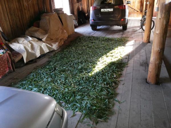 Рассыпаем ровным слоем (3-5 см) в любом подходящем помещении (гараж, кладовка, чердак и т.п.).Оставляем кипрей подвяливаться. Сразу скажу, что я его не мыл, так как до сбора четыре дня шли дожди.
