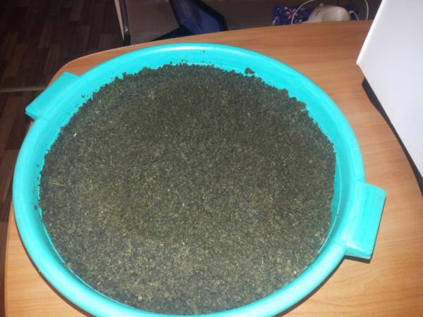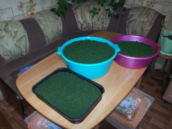 Ждём, ориентировочно, пару дней и видим, что края у листьев стали немного заворачиваться. Это значит, что кипрей завялился и готов к дальнейшей обработке. Собираем его в тазик и несем на кухню.