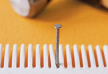 А вот расческа позволит выставить сразу ряд гвоздей, при этом не только сможет их удержать, но и обеспечит равную дистанцию между ними. Необходимо лишь отсчитать нужное количество зубьев и вставить гвоздь между расчетными.