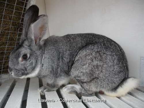 Советская шиншилла даже по своему наименованию говорит о том, что была выведена довольно давно, еще в СССР. Средняя живая масса взрослых животных — 5 кг, с колебаниями от 4,2 до 7 кг. Длина тела — 60—65 см, обхват груди — 37—42 см. Молодняк в возрасте 2 месяцев весит 1,7 кг, 3 месяцев — 2,3—2,8 кг.