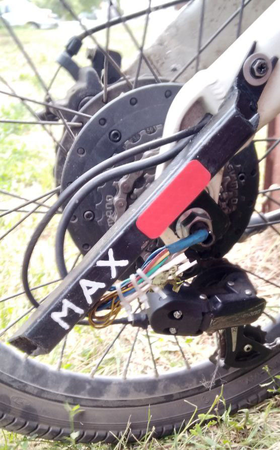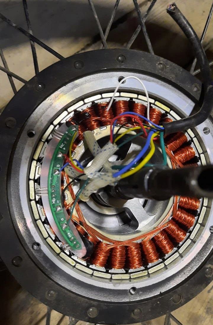 Провода были выведены через втулку, колесо собрано и поставлено. А потом я эти провода уже припаял к оборванному проводу с другой стороны.