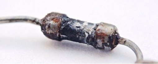Если же резистор не справится с возложенными на него задачами, не важно по каким причинам, будь то просчет конструктора или нештатные отклонения тока в схеме. В этом случае он просто перегорит. Вначале перегреется, с него слезет красивая краска с полосками или буковками, а далее и вовсе почернеет и станет не похож сам на себя. Вроде того, что представлено на нашем рисунке.