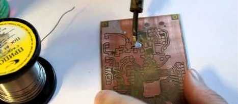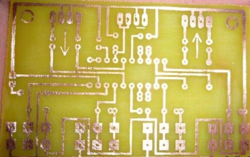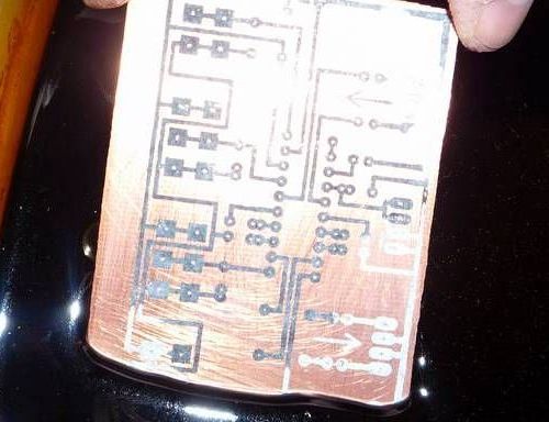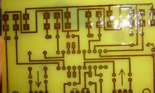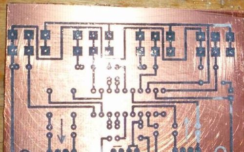 Опять берем мелкую шкурку и стираем тонер, который остался поверх наших дорожек. В итоге получается блестящие медные дорожки.