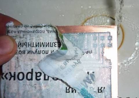 Теперь прикладываем эту бумагу, с распечатанными на ней дорожками к текстолиту, и все нагреваем утюгом. В результате этого действа бумага через тонер прилипнет к плате, вернее пока еще к текстолиту. Сейчас бумагу необходимо удалить. Как это сделать, если она держится лучше бешеной собаки, а зубов у нее нет!? Здесь поможет только вода, которая и размочит нашу бумагу, превратив ее в кашу.