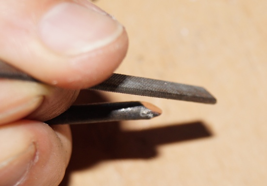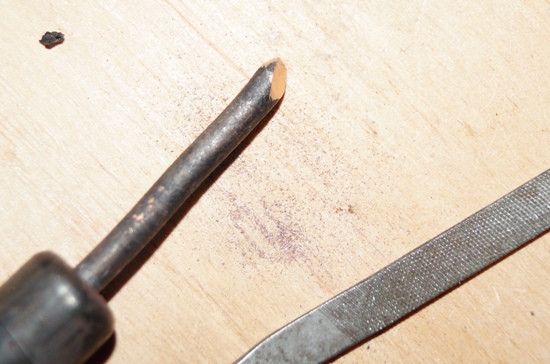 Как я уже рассказывал вам, медное жало со временем выгорает и в итоге меняет свою форму. В итоге необходимо время от времени приводить его форму в порядок. Лучше всего ковать жало, то есть использовать молоток и наковальню, так и выстукивать нужные формы. Но если этого нет, то вполне можно обойтись и простым надфилем.