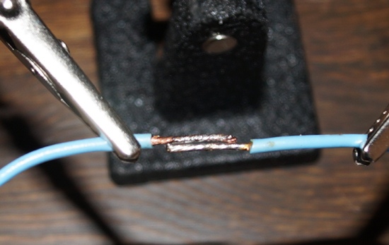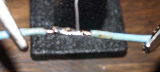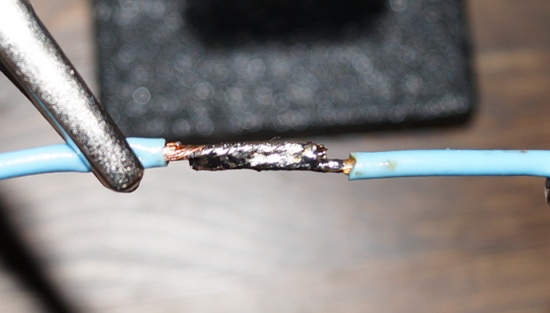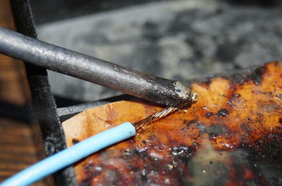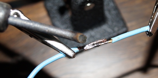 Такую же процедуру проводим и с другим проводником. Теперь можно спаять проводники между собой. Выставляем их так, как нам необходимо и каждый раз принося на жале пальника немного припоя, заливаем щель между проводниками.