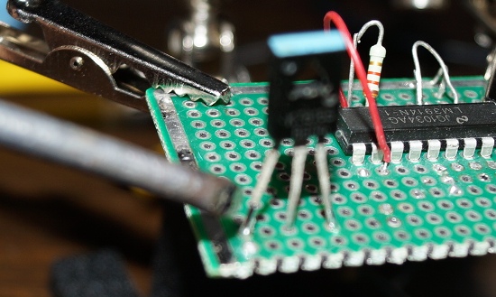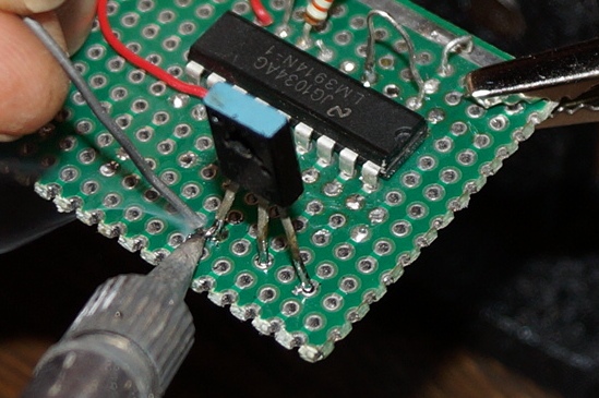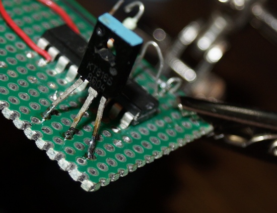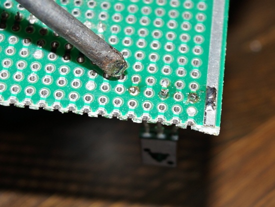 Теперь о пайке на плату. Здесь опять же надо начать с лужение дорожек платы. Если вы монтируете что-то на универсальную монтажную плату, то сразу берите плату с лужеными контактами. Далее выпрямляем контакты радиодетали и вставляем их в отверстия, так , чтобы они выступали с другой стороны на 0,5-1 мм. Теперь, как и в случае с проводом берем припой на жало и подносим его к месту ножка-отверстие.
