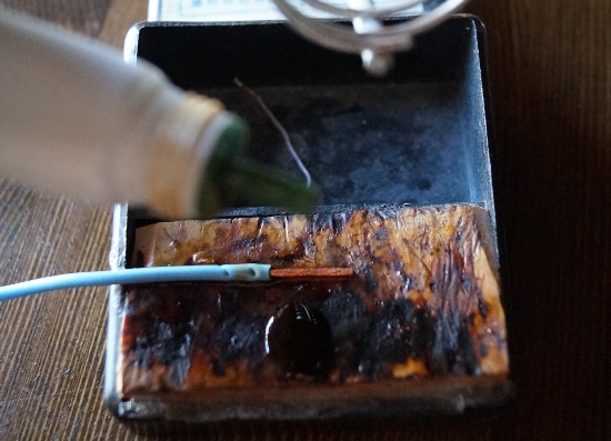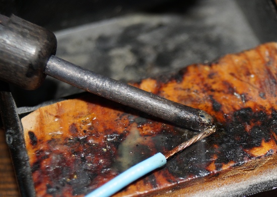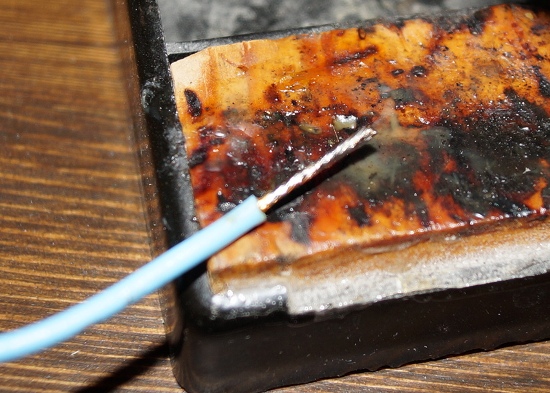 Укладываем провод на площадку и лудим. К слову, в качестве площадки для лужения прекрасно подходит деревянная вставка. Дерево со временем впитывает в себя жир и флюсы, а при необходимости может наоборот отдать их на проводник.