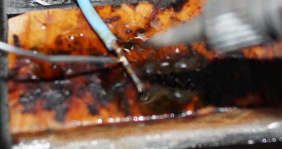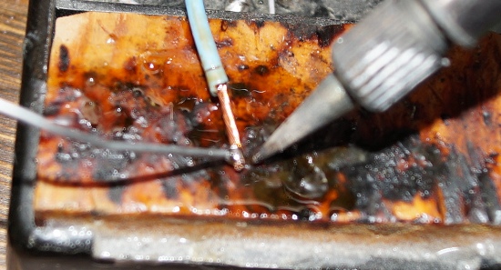 В этот раз процесс лужения провода будет проводить с использование флюса, а не жира. Капаем несколько капель на зачищенные от изоляции и окислов контакты под пайку.