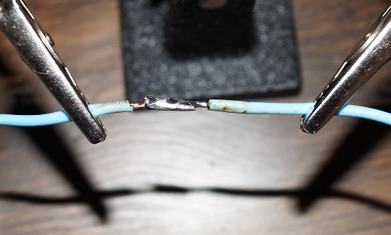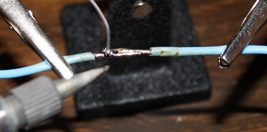 Теперь выставляем проводники друг относительно друга и используя припой, который подается проволокой, разогреваем его и заливаем в щель между проводников.