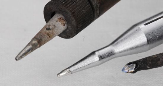 Однако есть и другая стратегия пайки, она возможно из-за несгораемых жал. Последние нашли обширное применение в наше время. Такие жала выполнены из композитного или тугоплавкого материла, часто покрыты твердым напылением, на которое не осаживается припой или осаживается очень ограниченно. В итоге, жало постоянно чистое и разогретое. Посмотрите на фото выше, медное жало справа выглядит совсем неказисто, если его сравнить с несгораемым жалом.