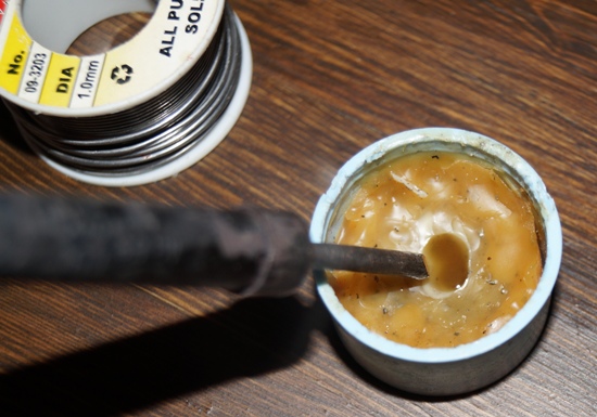 Теперь о флюсах и кислоте. Кислота и флюс наносятся с помощью кисточки или носика непосредственно в место пайки. Кислота фактически активный реактив, в ней находится кислота (соляная) и цинк. При попадании на металл, кислота съедает его поверхностный слой и продукты окисления на нем, а цинк остается после как коррозионно-сдерживающее. В любом случае, после пайки кислотой лучше промывать эти места от дальнейшего продолжения коррозии, используя соду или воду. Флюс в большинстве случаев это жидкий реагент вроде канифоли или паяльного жира, он не столь активен. Часто это канифоль растворенная в спирте, может еще какие-то добавки… Если резюмировать, то для пайки достаточно только паяльного жира или канифоли. Теперь о инструментах.