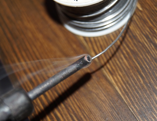 Затем берем припой и наносим на разогретое жало. Припой сам растечется по его поверхности. Все жало готово к использованию.