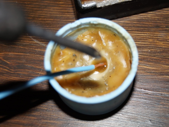 То есть теми реактивами, про которые я вам писал ранее. Именно они поспособствуют лужению, а как итог, и самой пайке. В нашем случае это паяльный жир, я разогрел его и обмакнул провод в него.
