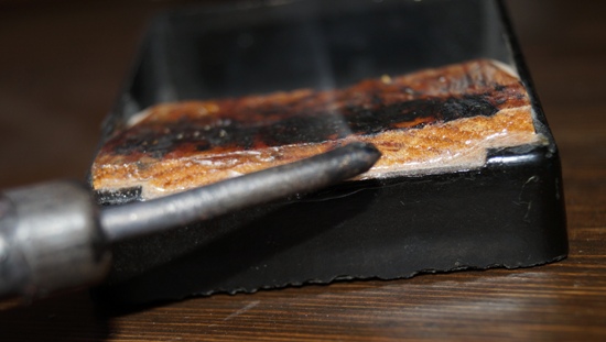 Надо сказать, что медь металл мягкий. Обрабатывает его соответственно легко. После такого придания формы необходимо защитить жало от окисления. Делается это просто, нанесением на поверхностный слой жала припоя, который выполняет две функции. Во-первых, с его помощью мы паяем, о чем мы уже рассказали. Во-вторых, он защищает жало от окисления и выгорания. Итак, когда мы на холодную обработали жало, то включаем паяльник. Пока он греется, но не прогрелся, можно окунуть жало в канифоль или паяльный жир.