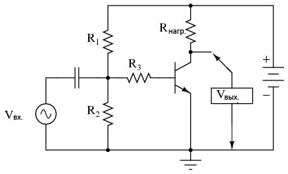 На схеме показан усилитель с общим эмиттером, в котором цепочка резисторов смещения образована резисторами R1 и R2. Конденсатор связывает Vвх с усилителем таким образом, что источник сигнала не имеет напряжения постоянного тока, сообщённого делителем напряжения R1/R2. Резистор R3 служит для контроля над коэффициентом усиления напряжения. При максимальном коэффициенте усиления напряжения данный резистор можно опустить, но поскольку подобные резисторы базы часто используются в схемах усилителей с общим эмиттером, на рисунке он показан.