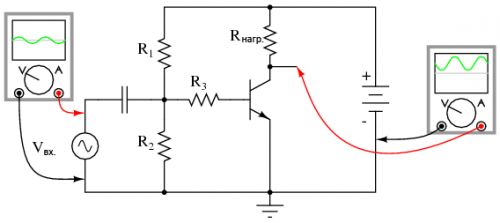 Как и все усилители с общим эмиттером показанный усилитель инвертирует усиленный входящий сигнал. Иначе говоря, нарастающее напряжение входящего сигнала ведет к падению напряжения на выходе и наоборот. На рисунке ниже показаны формы кривой на осциллографе.