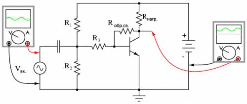 Поскольку выходной сигнал представляет собой копию входного сигнала в зеркальном отображении, любое соединение между выходом (коллектором) и входом (базой) транзистора (как показано на рисунке ниже) создаст отрицательную обратную связь.