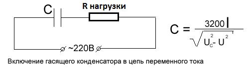 Прежде чем мы рассчитаем конкретный пример, скажем пару слов скажем о том, как же работает гасящий конденсатор в цепи переменного тока. По сути в этом случае конденсатор работает как ему и полагается. При первой полуволне он заряжается, пропуская ток и напряжения. Затем после зарядки он просто «закрывается». Хотя полуволна еще не завершена. В этом случае и происходит ограничение питания для последующих радиоэлементов. Далее, при обратной полуволне, все в том же порядке, но направление протекания тока и напряжение через конденсатор происходит в обратном направлении. В итоге, так и происходит ограничение по напряжению и току. Конденсатор просто закрывается в определенный момент, вот и все. По сути его закрытие будет зависеть от сопротивления потребителя, от емкости конденсатора, от частоты переменного тока. Не будем копаться в дебрях, а сразу приведем конечную формулу. Вот она.