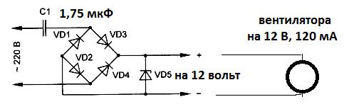 Дело в том, что использовать полноценный трансформаторный блок питания не всегда рационально. Это дорого, громоздко, он сам по себе тяжелый. В этом случае использование обычного гасящего конденсатора способно разрешить все эти проблемы. По сути, гасящий конденсатор используется много где. Скажем с помощью него можно подключить светодиод к 220 вольтам. О такой схеме мы уже рассказывали в статье «Как подключить светодиод к 220 вольтам». Его можно использовать для подключения практически любого радиоэлемента. Здесь главное не увлечься большими токами, так как в этом случае конденсатор может не выдержать, ну и само собой перегорит, а что еще хуже, что-нибудь сгорит вместо него. Ограничим условно ток для таких блоков питания в 150 мА. Такого тока вполне достаточно, чтобы подключить вентилятор от компьютера. Для чего его необходимо подключать это уж решат вам. Может он будет использоваться для активного охлаждения радиодеталей, а может для чего другого. Это не важно. Итак, как же подключить куллер, вентилятор к 220 вольтам? Об этом в нашей статье