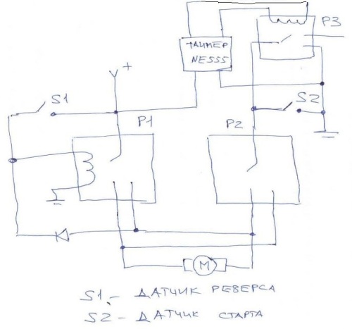 Теперь о самой схеме. Здесь применено 3 реле, при этом два из них (Р1 и Р2) отвечают за переключение напряжения питания, то есть за переполюсовку питания, а третье реле шунтирует концевой датчик старта в течение 1,5 минут за счет работы таймера. За это время каретка успевает отойти, таймер и реле отключаются, но при этом замыкается датчик старта, за счет этого и продолжает подаваться питание на двигатель каретки. Как замыкается выключатель реверса, реле включаются, на двигатель подается обратная полярность. Реле самоподхватываются через диод. В итоге двигатель гонит каретку в обратном направлении до датчика старта, который теперь будет датчиком финиша. Диод нужен чтобы не допустить КЗ пока когда будет нажат датчика реверса. Таким образом, собственно и реализуется тот самый цикл, который мы рассмотрели выше.