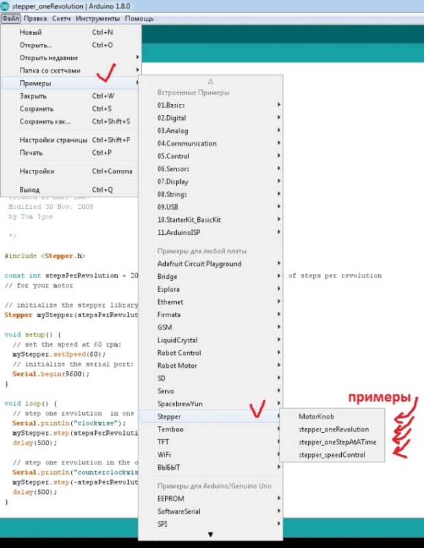 Собственно все, у вас появиться теперь возможность перейти в примеры, потом в stepper и вы можете выбрать готовый скетч. Мы даже приводить скетч не будем, так как он все равно не будет работать без библиотеки, а при ее установке все примеры у вас появятся сами собой.