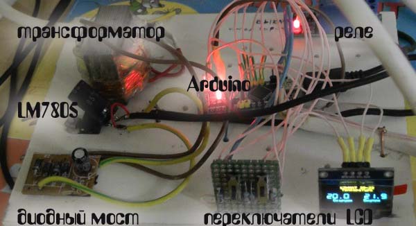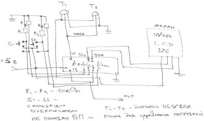 Что на счет схемы, то лучше ее не описывать, а взглянуть на картинку – скетч, который я набросал от руки. Ну и как всегда бывает с изделиями на микроконтроллере, данное подключение к органам контроля, и управления актуально лишь для того ПО, которое залито тут же, в статье ниже. То есть вполне возможно осуществить и другое подключение, но это необходимо будет корректировать и прописывать программно.