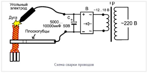 Один контакт зажимается на скуртке проводов, про которые мы уже рассказывали чуть ранее, а вторым электродом, который представляет собой угольный электрод, прикасаются к концу скрутки. В итоге, после протекания тока, концы скрутки оплавляются и соединяются. Так и образуется монолитное соединение.
