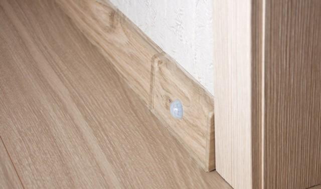 Собственно всего-то и остается как разместить все согласно своих логических и смысловых предназначений и запитать от сети. В нашем случае датчик настолько мал, что его удалось установить прямо в плинтус. Важно при этом направить датчик на то место, где будет в первую очередь проявляться движение, в случае если вы входите в помещение, которое потребует подсветки.