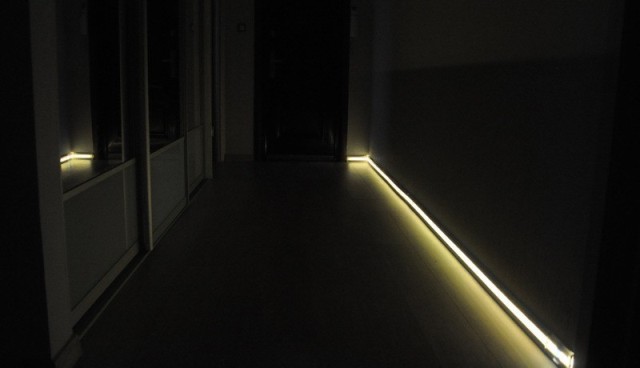 Эта статья более не о технической части того, как можно реализовать подсветку, а о самой идее ее воплощения. Скажем у вас все на месте, какие-либо провода ой как тянуть не хочется, весить бра тоже, а подсветку надо. Так вот, в этом случае мы можем вам предложить альтернативное решение, когда подсветка устанавливается в плинтус. Проще говоря, снимается сам плинтус, остается лишь от него удерживающий остов, затем монтируется светодиодная лента, а потом плинтус ставится на место. Ну, давайте об этом подробнее и в картинках.