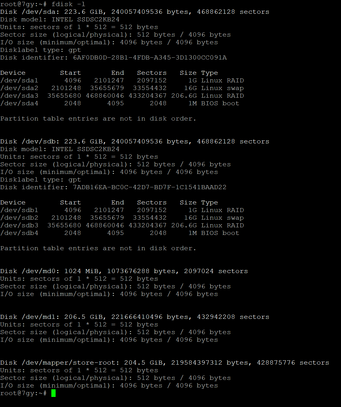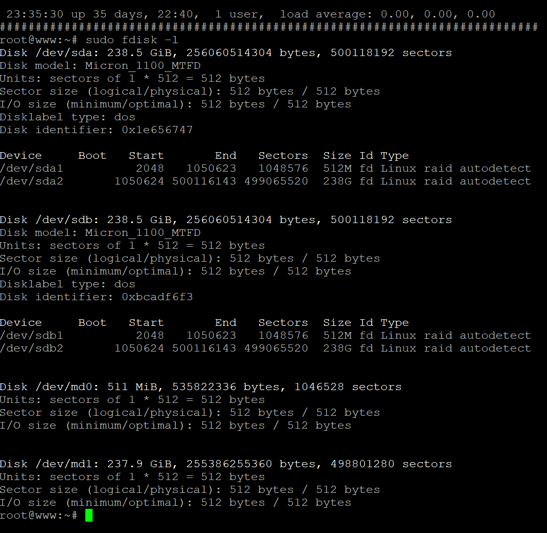 Эта команда позволит увидеть нам какие диски стоят на сервере. В нашем случае это dev/sda и dev/sdb со своими индексами 1, 2, 3... (* - серверы разные, поэтому и диски на картинках получились с разными индексами)