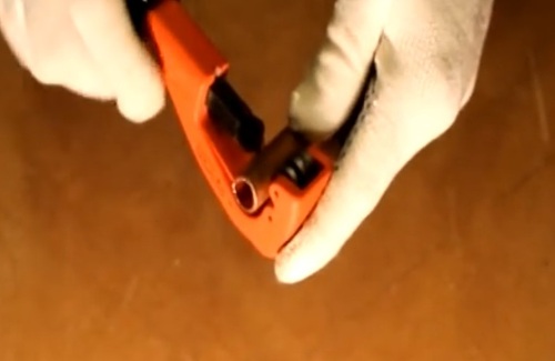 Первым делом необходимо вымерить трубу, то есть отрезать ее, чтобы строительная длина и длина фитингов была в соответствии с вашей схемой монтажа. Если фитинги уже не отрежешь, то вот трубу можно. Резать ее надо с помощью трубореза, в этом случае края будут ровными и правильной формы. Можно конечно отпилить ее ножовкой по металлу, но это уже технологии прошлого. Итак, отрезаем трубу с помощью трубореза.