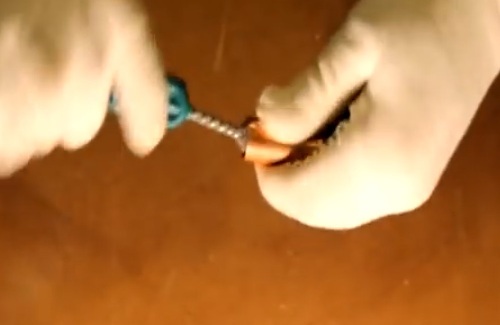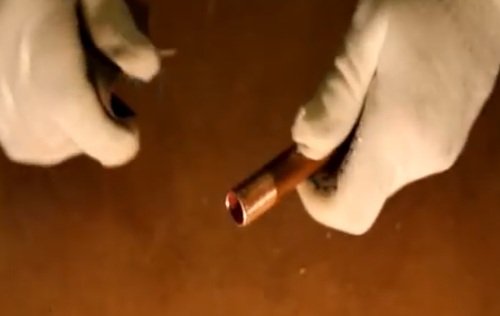 Теперь очищаем поверхность трубы от окислов меди, от мелких неровностей, грязи. Берем обычную наждачную шкурку и чистим ту поверхность, которая будет заходить в трубу фитинг.