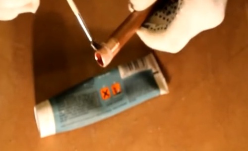 После очистки поверхности приступаем к нанесению пасты для пайки. Сразу скажем, что паста эта специальная, но обладающая заурядными свойствами. Так ее суть сводится к предотвращению окисления. К равномерному распределению температуры во время нагрева меди. К лучшему растеканию припоя, во время пайки. Пасту выдавливаем из тюбика или берем из баночки, у кого она в чем, и наносим на трубу кисточкой. Тонкий слой, не более того, вполне достаточен.