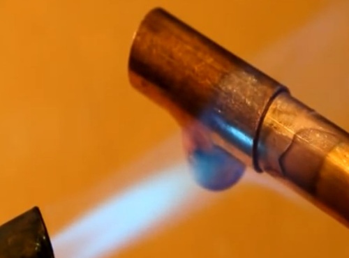 Здесь важно ее не перегреть, а то после труба станет слишком мягкой. Температура плавки припоя порядка 400 градусов, если это мягкие припои. При этом труба должна нагреться примерно до 425 градусов. Визуально это конечно трудно оценить, тем более если не иметь опыта, но труба не должна быть раскалено до красна, это факт. В качестве припоя можно использовать припои: П81/П14, FELDER (Германия) или аналогичные. Приставляем припой на край зазора между элементами, при этом он сам начнет плавиться и растекаться по мету нанесения пасты. Действие несколько даже завораживающее.