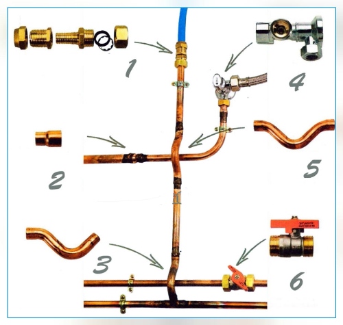 Дополнительно хотелось сказать о том, что медные трубы выступают в качестве основного проводника для сред, а перед каким-либо устройством либо узлом, используется запорная, регулирующая арматура, либо гибкий шланг и т.д. В этом случае пайка уже не поможет. Здесь придется вернуться к механическим способам крепления с помощью применения адаптеров и уплотнений. Так в качестве примера – картинки можно взглянуть и прикинуть, что вам может понадобиться, если кроме прокладки трубопровода вас ждут и другие соединения медной трубы с сантехническими узлами.