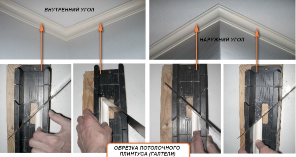 Теперь, когда мы определились с плинтусом, с его материалом, с клеем который подойдет для него, приведем конкретные примеры того, как же клеить потолочный плинтус не его законное место. Наиболее сложные участки в помещении будут углы, внешние и внутренние. В этом случае плинтус придется отпиливать, отрезать под углом. Именно вымерять место отреза, а также выбрать правильный угол, и будет составлять главную и первоочередную задачу, от которой будет зависеть успех всего мероприятия в целом. Давайте теперь разберем конкретный пример монтажа для внутреннего и наружного угла. …для внутреннего угла
